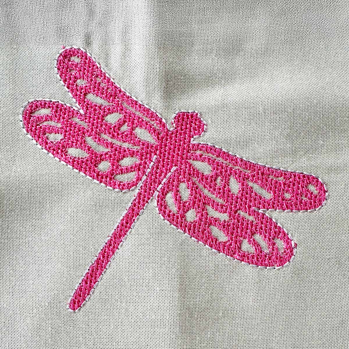 This dragonfly embroidery design features open line stitching with intentionally unstitched areas.