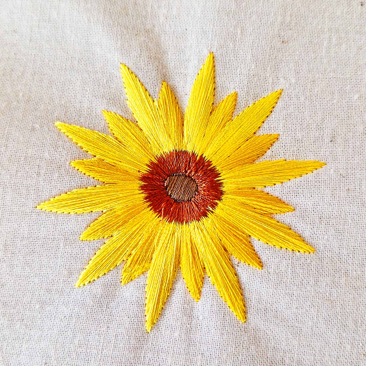 Thanks to the long satin stitches, the petals catch the light and give the embroidery a slightly luxurious look. Therefore, even simple fabrics can look special once this sunflower is stitched.